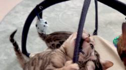 ネコちゃんは車の中でも我が家に着いても、不安がることもものおじすることもなく、落ち着いて過ごし、数時間もたつと元気に遊び始め、私の膝の上でゴロゴロと甘えてきてくれます。生まれてから2か月、とても愛されて大事に育てられてきたのがとてもよくわかります。